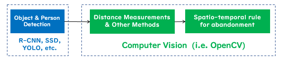 Another and more recent approach are through the use of more powerful CNN frameworks for people and object detection. Some famous models include the R-CNN and YOLO models, to generate class labels and bounding boxes, which would be used in the logic design of further frame processing i.e. calculating distances over time, and the application of spatio-temporal rule of abandonment.
