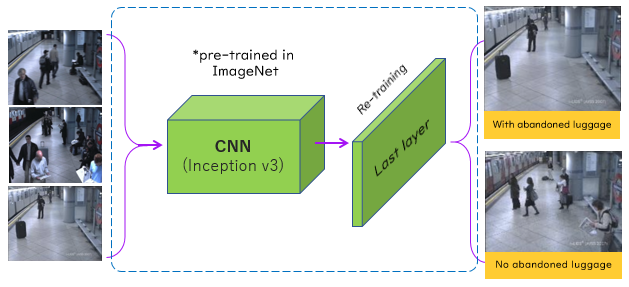 In Contractor, et. Al (2018), using Inceptionv3 pretrained on ImageNet, the last layer was trained with annotated frame data to differentiate between scenes with and without abandoned luggage. In this simple approach, the model learns the background and can therefore detect abandoned luggage as an anomalous event, which can be useful for creating models specific to location and the type of event.
