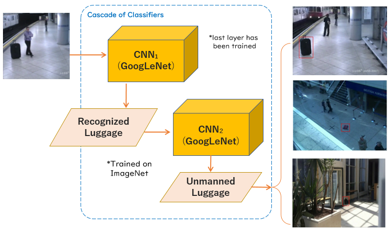 As in Figure 5, the first CNN is for verifying that the detected static object is a luggage item, while the second is for verifying true abandonment. In particular, GoogleNet pre-trained on ImageNet was used to train the last layers of each CNN. In this specific approach, generated data including images of luggage and people holding or standing near the lugagge were used to train the CNNs.