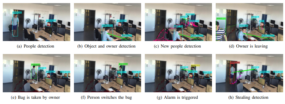 A combination of foreground estimation to detect static regions as candidates of abandonment, and use of Faster RCNN for person and object detection, and re-identification was used in Yang et. Al. (2018). Further frame processing was performed to calculate the average distance between the detected static object and detected persons nearby; spatio-temporal rules were then applied to perform owner labeling and detect abandonment event. This was further extended to performing event analysis such that they can classify if an object being tracked was (1) taken by owner, (2) moved by un-owner, or (3) stolen by someone; sample results are as shown in Figure 7 below.