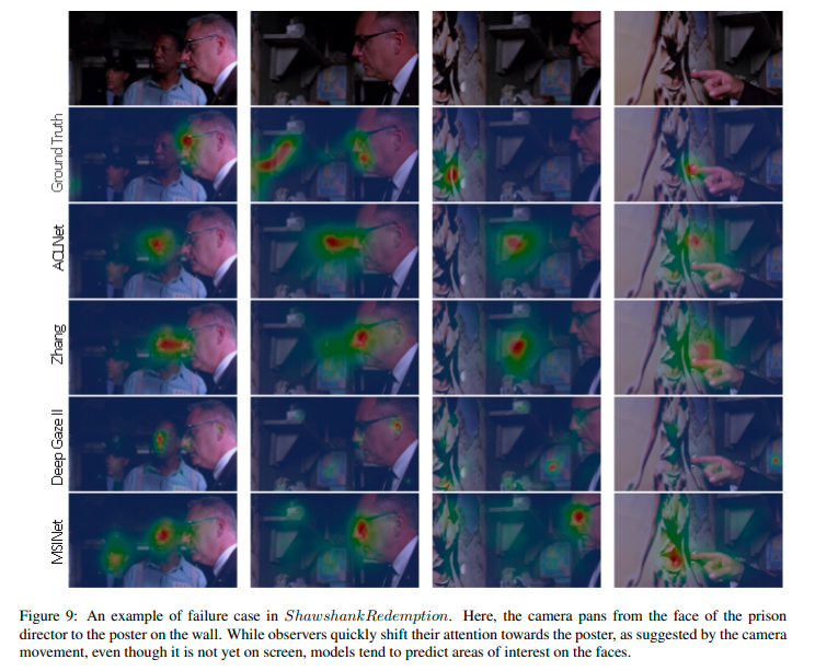 実際に以下の『ショーシャンクの空に』(名作ですね、大好きです)の例を見ると、カメラの動きと共にGroundTruth(実際の、正解の視線データ)はポスターに視線が移動されており、ACLNet, Zhang, DeepGazeII, MSINetの結果と差分があります。