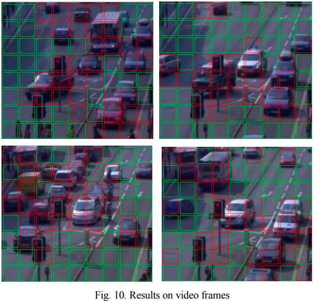 交通状況を示す画像からHOG(Histogram of Oriented Gradients)とLBP(Local Binary Patterns)という画像の特徴を抽出し、交通情報を持つセルの数(以下の図の赤枠セル)から交通密度を算出しています。
