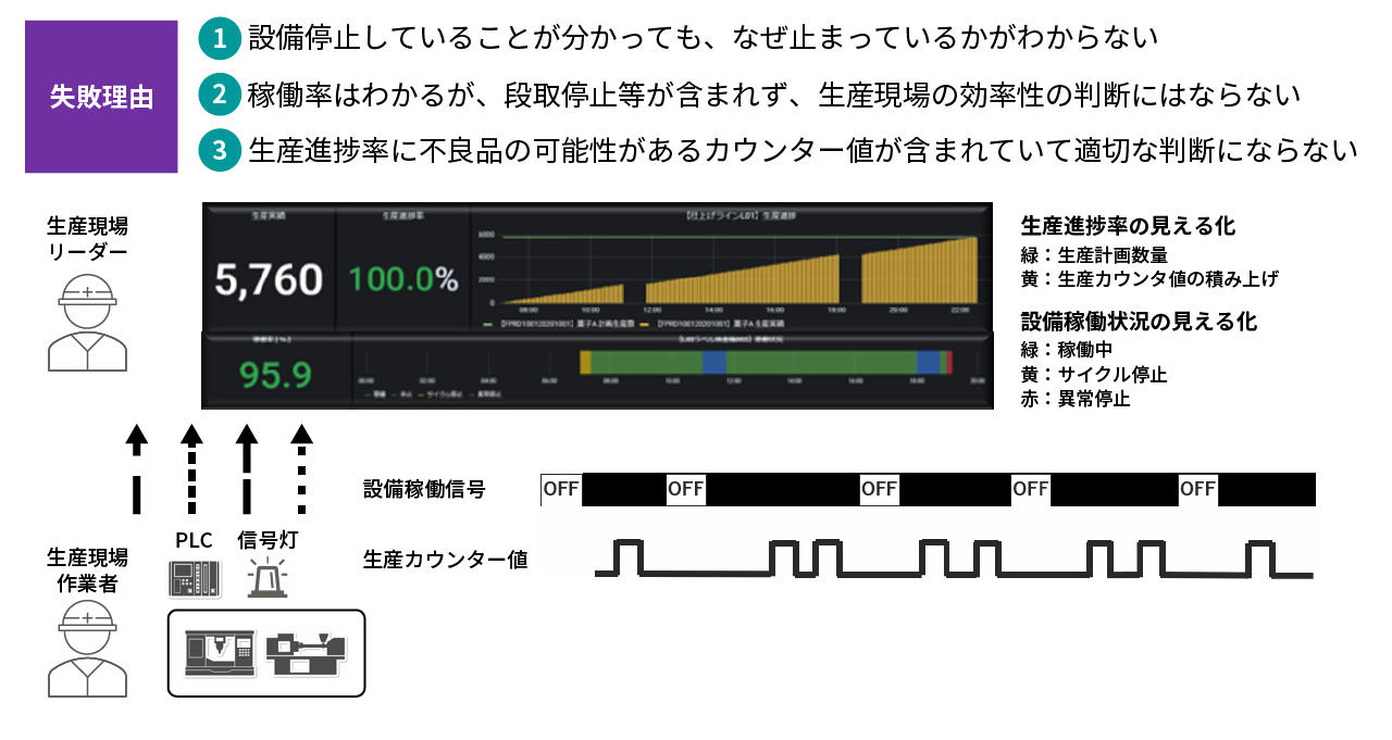 しかしながら、こういったリアルタイム可視化というのは、生産現場では、長く生産活動に携わっている方であればあるほど、肌感覚で十分わかっていることが多く見える化による効果は低いものです。そして、生産現場リーダーからすると、「設備が停止していることが分かってもなぜ止まっているかがわからない」「稼働率といっても段取停止といった一部の停止が含まれないため正しくない」「生産進捗率といっても生産量に不良品数が含まれるため正確な値ではない」といって参考程度にしからならず大きな変化や効果をもたらすものではありませんでした。最終的に、こういった見える化画面が誰からも閲覧されなくなった経験をされた方もいらっしゃるのではないでしょうか?
