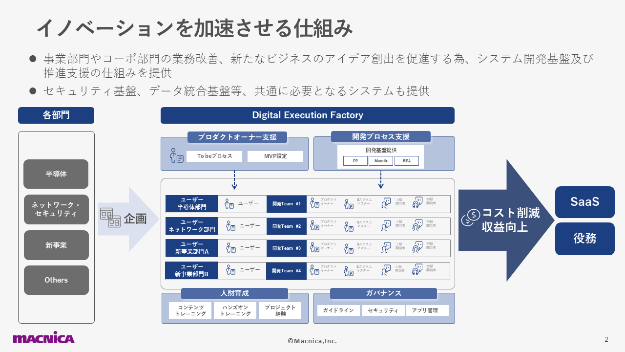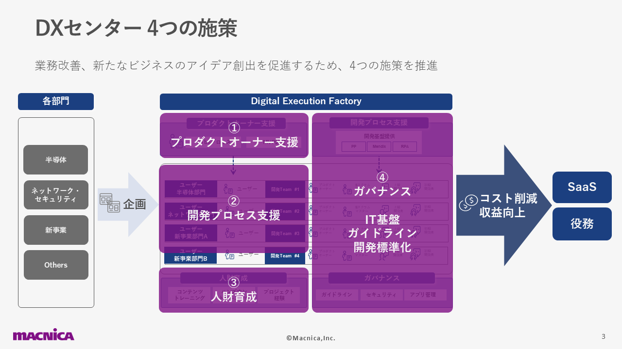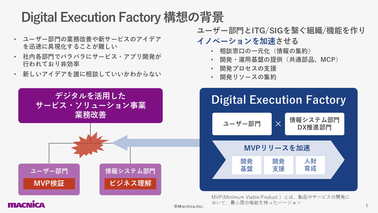 こうした状況を打開するため、マクニカではDX推進部門と情シス部門が協力して「Digital Execution Factory」を立ち上げました。デジタルテクノロジーを使った新しいサービスやソリューションの開発において、ビジネス部門は早くモノを作ってMVP検証を行い、リリースしたいはずです。これまでの情シス部門はそのサポートが十分にできていなかったのですが、今後は積極的に参画し、知見を活用して貢献していきます。