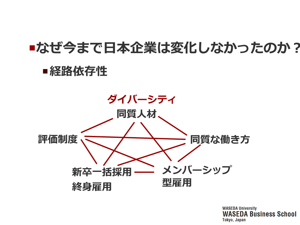 会社には複雑で色々な要素がありますが、それらが合理的に噛み合っているからこそ回っています。しかし、全体が噛み合っているがゆえに、どこか1箇所だけが時代に合っていない場合に変えようとしても変えられないのです。分かりやすい事例はダイバーシティ経営で、世間で声高に叫ばれている割に、日本では全然進んでいません。私はこのテーマについてもよく講演しているのですが、やはり「ダイバーシティだけをやろうとしても無理です」という話をします。なぜなら、それ以外の要素がダイバーシティと真逆の同質人材と強固に噛み合っているからです。