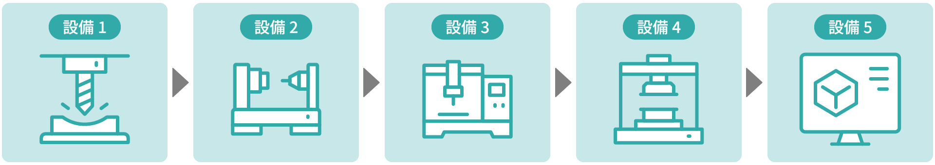 今回のデモで扱う生産ラインは、設備1〜設備5が直列に並ぶシンプルな構成です。製品は左から右へ順番に加工され、最終工程を通過した時点で完成品としてカウントされます。