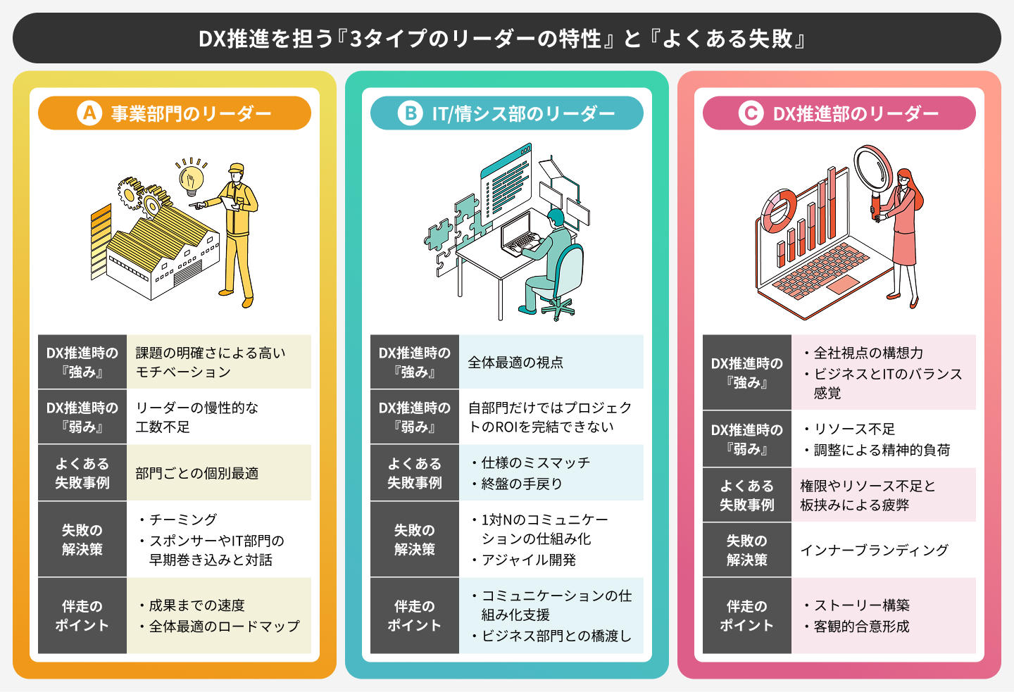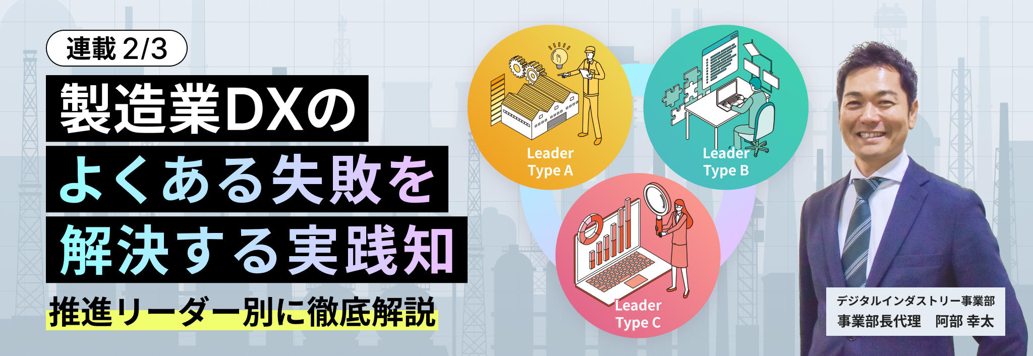 先の記事では、製造業DXを推進するリーダーを以下のように分け、各タイプの「強み・弱み・よくある失敗」について、長年製造業のDXを伴走支援してきたデジタルインダストリー事業部 事業部長代理の阿部に聞きました。