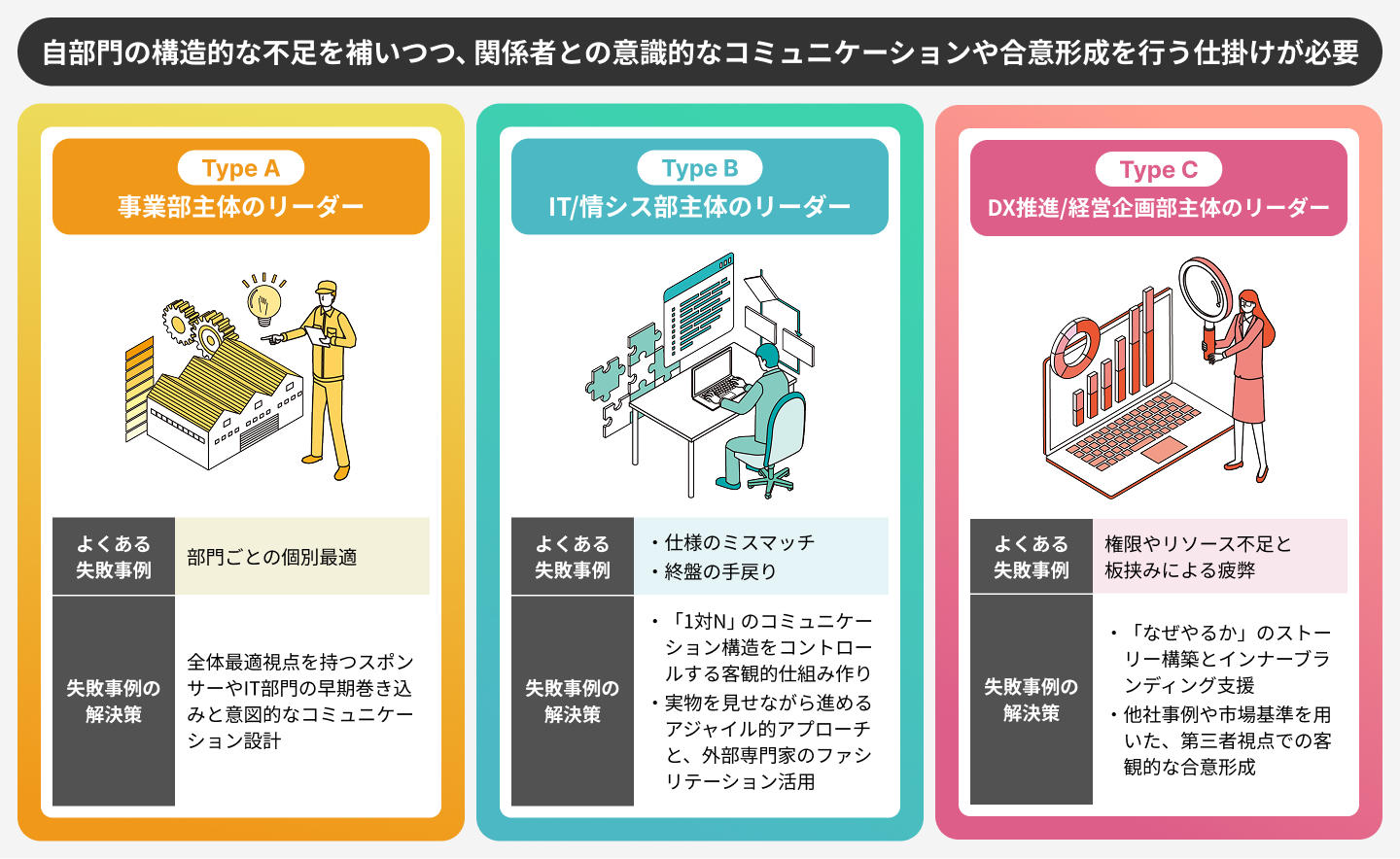 —— 次に、タイプB(IT/情報システム部門がDXを推進するケースのリーダー)のよくある失敗である「システムを使う側とのミスマッチ」をどのように解決すればよいでしょうか。