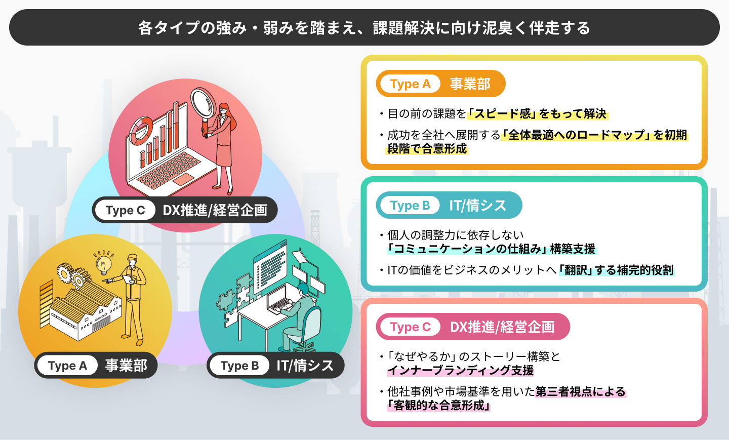 またタイプCは、業務やITに関する深い知見と誇りがある各部門から容易には納得を得られないことがあります。そこで私たちは、多種多様な企業でのDX推進の経験に基づく第三者の視点を提供し、各部門のメンバーと同じ目線で対話するための橋渡しを行います。