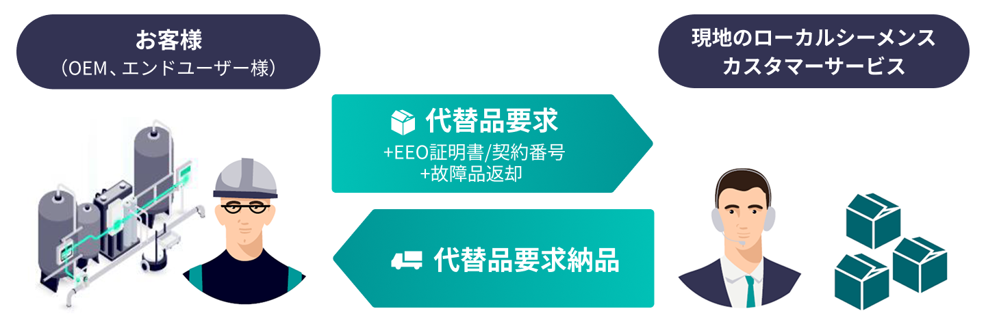 EEO では、故障時に代替品を要求する際、エンドユーザーが世界各国の現地シーメンス拠点へ直接請求できる仕組みを提供しています。この仕組みにより、国や地域を問わず、迅速なパーツ供給が可能となり、グローバルでの設備稼働を支えます。以下の図は、「代替品要求の流れと、どのように現地のカスタマーサービスが対応するか」を示しています。