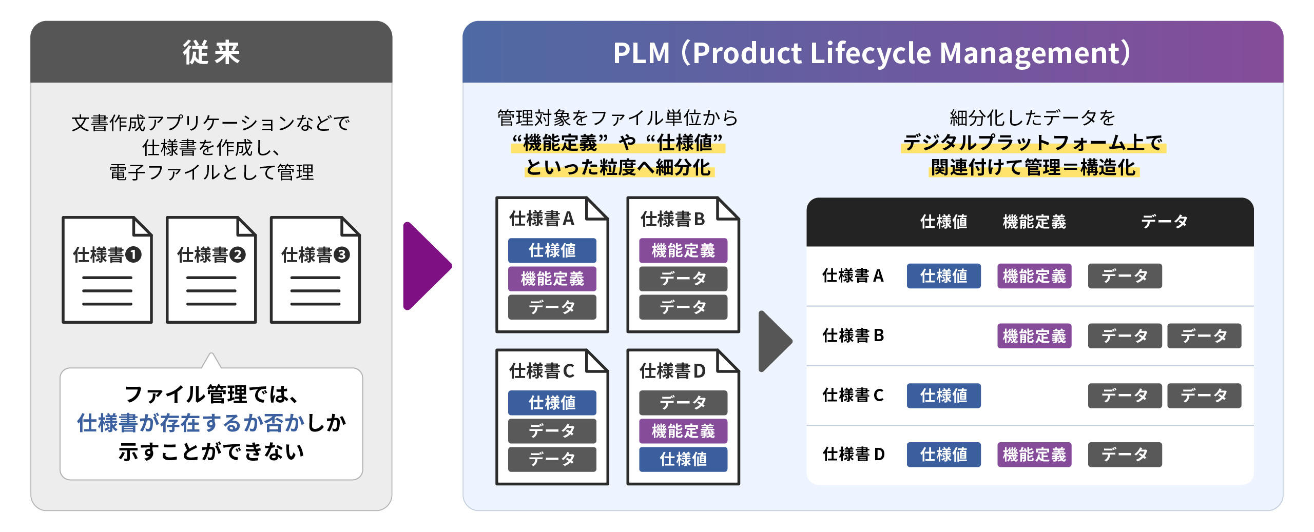PLM(Product Lifecycle Management)を活用することで、管理対象をファイル単位から“機能定義”や“仕様値”といった粒度へ細分化し、デジタルプラットフォーム上で構造化できます。それにより、初めてデジタルの有効活用を実現できるのです。