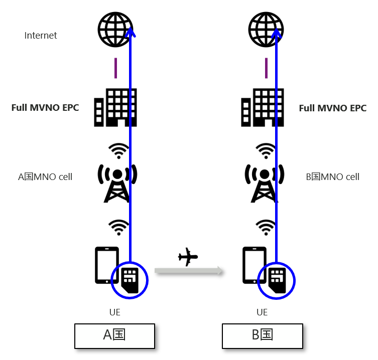 図の場合、A国B国で共にFull MVNOサービスを展開中であれば各国MNO基地局を介して通信可能です。