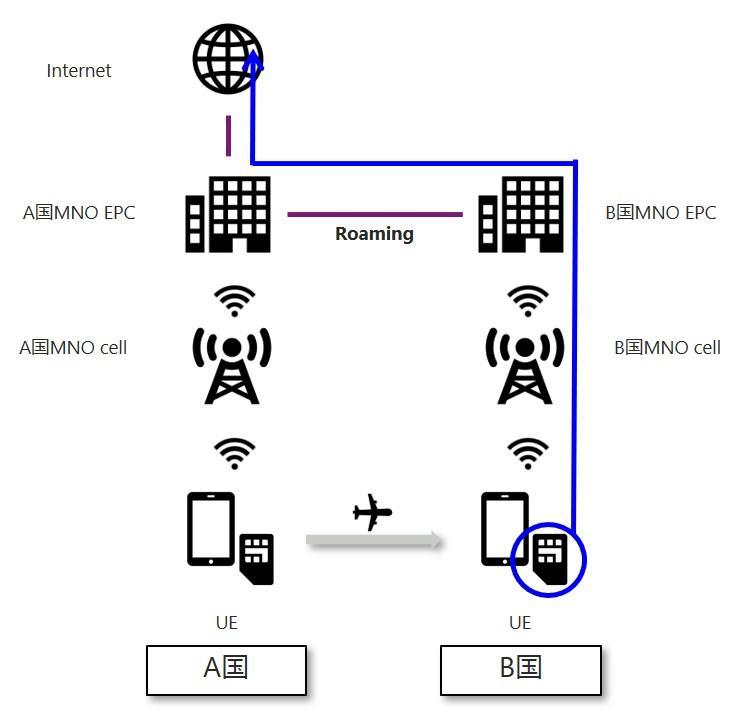 図の場合、A国事業者と契約中のSIMカードをB国に持ち込んだ場合、一度B国事業者を通じてA国のコアネットワークを介してインターネットに接続します。