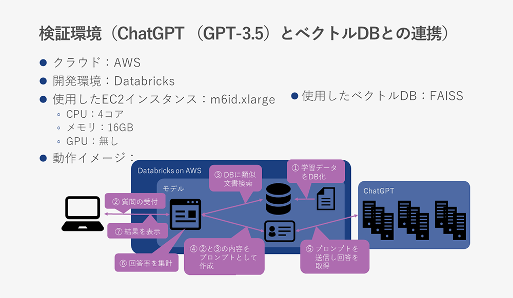 ChatGPTと検証データを保存したベクトルDBとの連携の検証環境は以下になります。