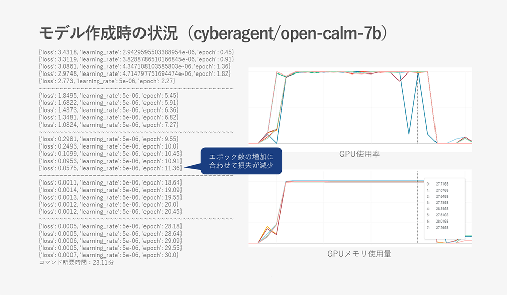 以下にファインチューニング時の学習状況とGPU使用率とGPUメモリの使用状況のスクリーンショットを残しておきます。