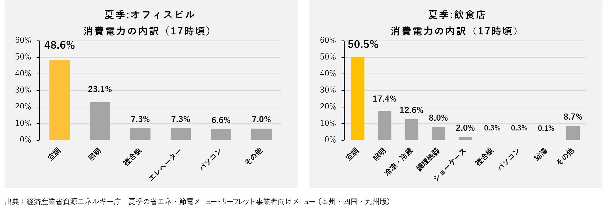 経済産業省資源エネルギー庁の調査では、オフィスビルの約49%、飲食店では約51%が空調による電力消費であることが示されています。