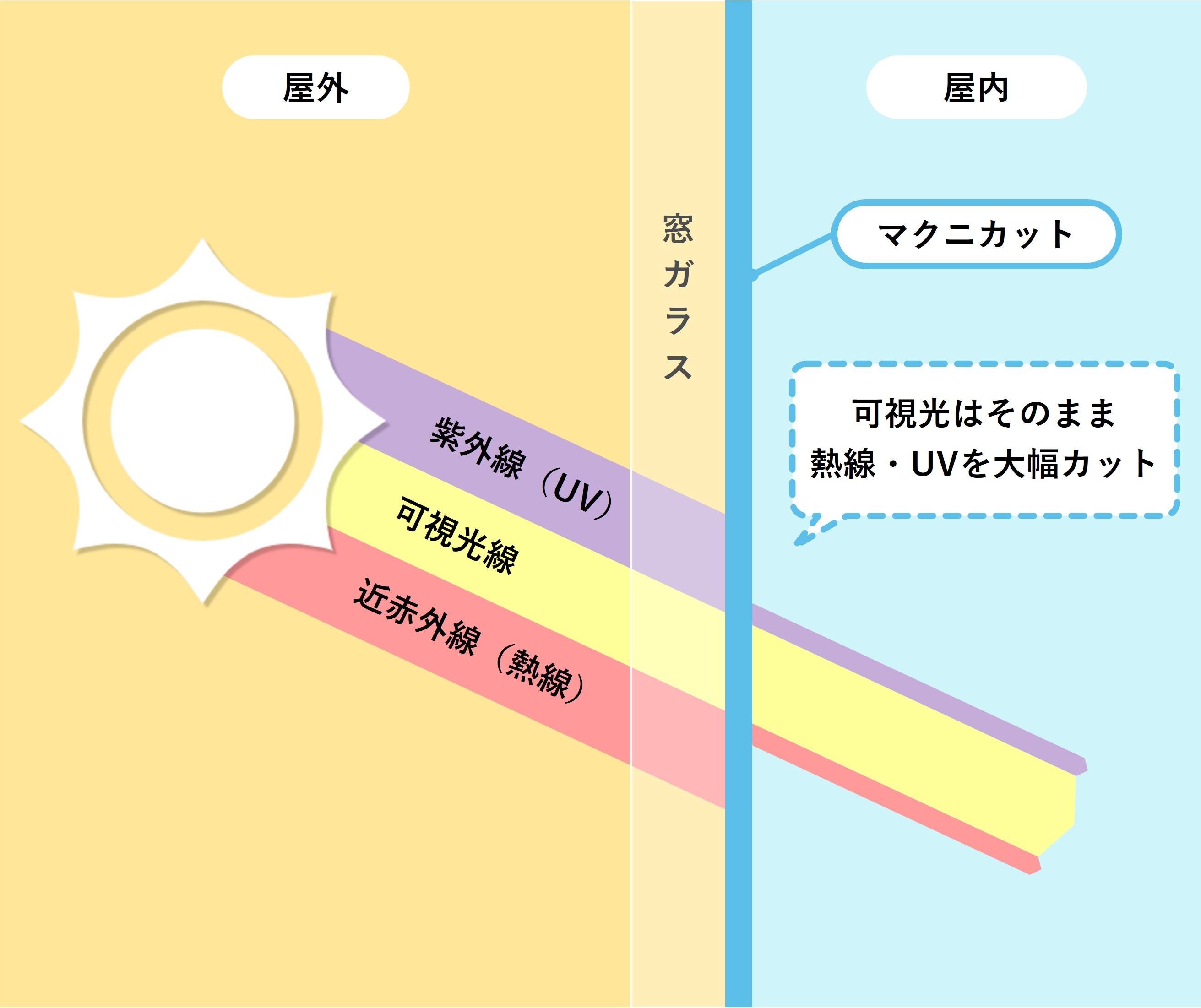 窓用遮熱塗料マクニカットのコーティング膜は、太陽光に含まれる可視光線を透過させながら、熱の主因となる近赤外線と、室内環境への影響が懸念される紫外線をカットする設計となっています。 これにより、視界や明るさを保ちながら、室内への熱の侵入を効果的に抑制します。