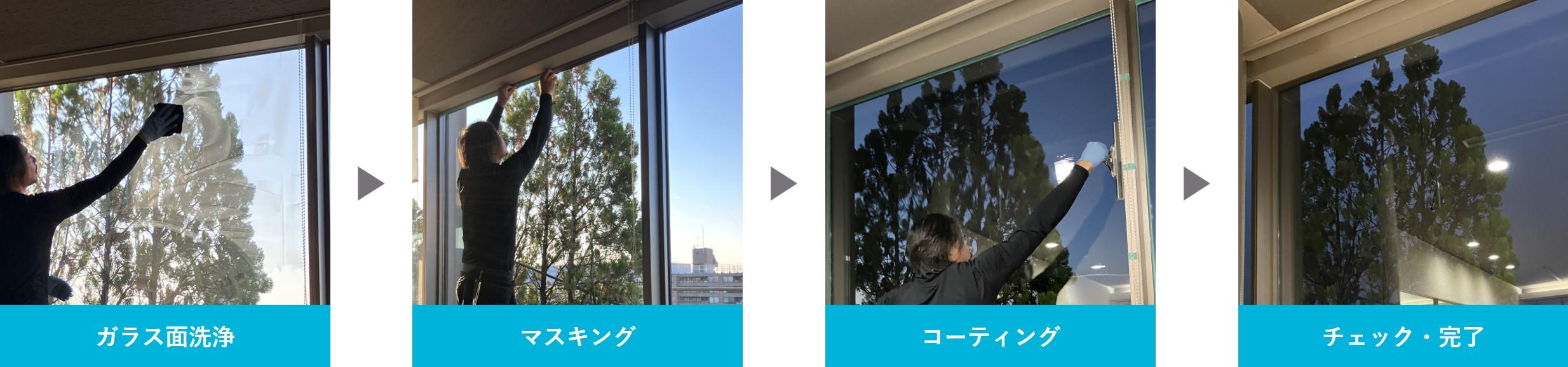 施工の流れとしては、ガラス表面の清掃・養生を行ったうえで、遮熱コーティングを施し、乾燥・仕上げ確認を行います。