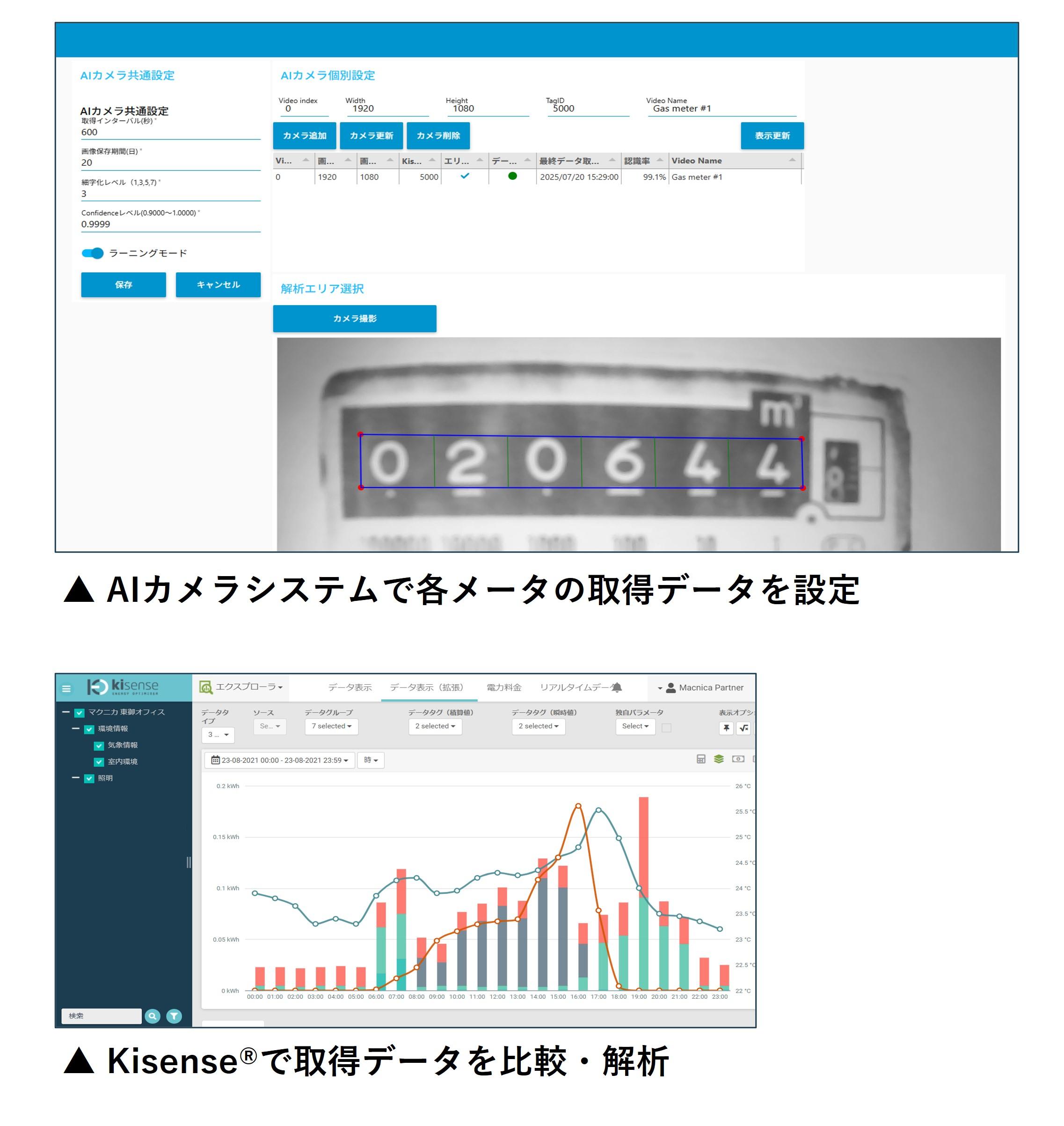 本製品は、ガスや重油などの既存メーターにAIカメラを設置し、画像解析技術でメーター値を自動で読み取るシステムです。取得したデータはエネルギー管理システム「Kisense®」に自動連携され、分単位の詳細データをリアルタイムで一元管理できます。現在対応している回転式メーターの他にも、今後は7セグメント表示のメーターなどへの対応も予定しています。