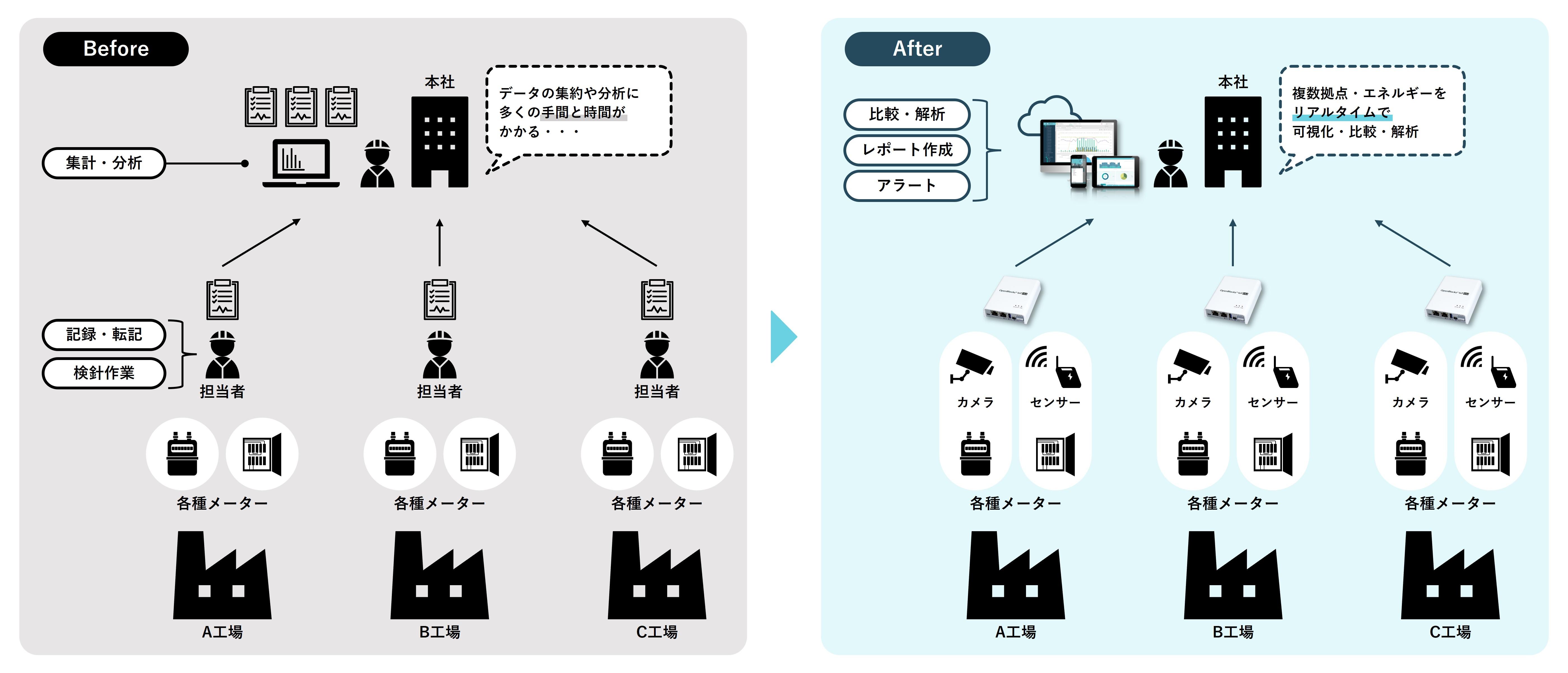 導入前は、各拠点ごとに手作業で検針・記録・集計を行っていたため、データの集約や分析に多くの手間と時間がかかっていましたが、導入後は、AIカメラによるデータ取得とKisense®によるクラウド一元管理により、ガス・電気・水道など複数のエネルギーをリアルタイムで可視化・比較・解析できるようになります。