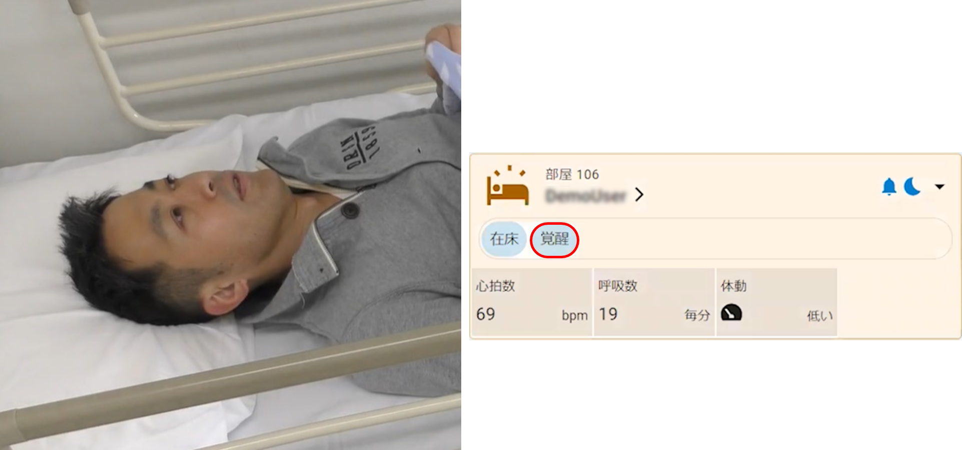 ベッド上での状態を、”在床、睡眠、覚醒、体動、座位、離床”の6つで表示します。