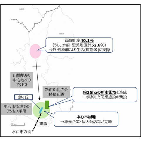 常陸太田市では、市街化区域に隣接する「東部土地区画整理事業地」を2019年5月に市街化区域に編入し、魅力ある新たな市街地として国道349号バイパス沿道の立地特性を活かした買い物環境の改善や新たな雇用の創出等を目的に、商業施設用地の整備を地域と連携して推進し、将来にわたり持続可能なまちづくりを進めています。