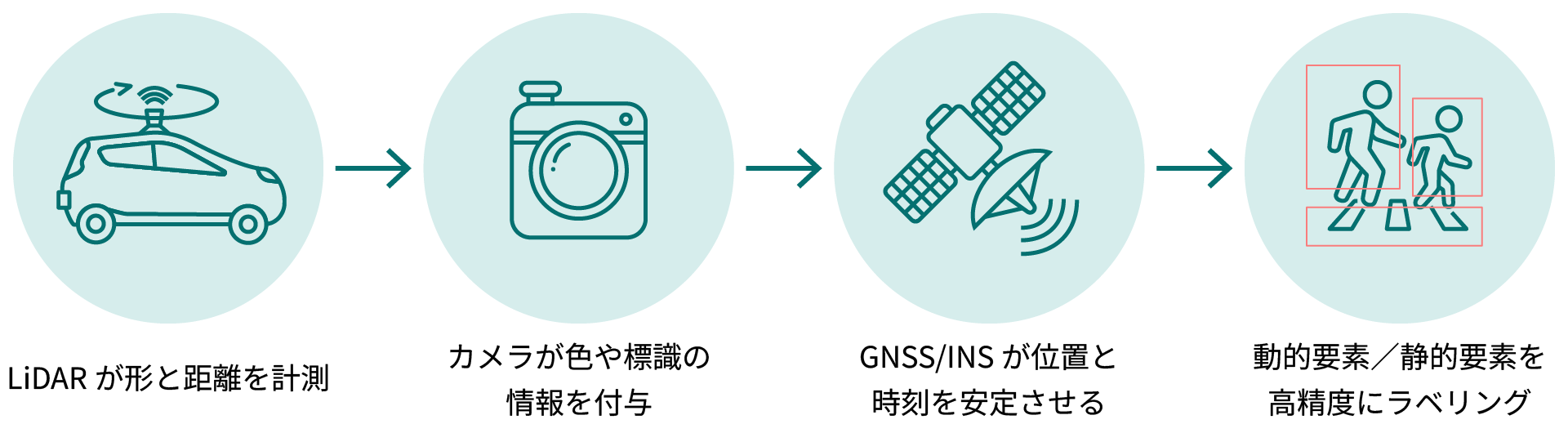 - 動的GT:車両、二輪、歩行者などの検出・追跡データ(トラッキングID付)を生成。