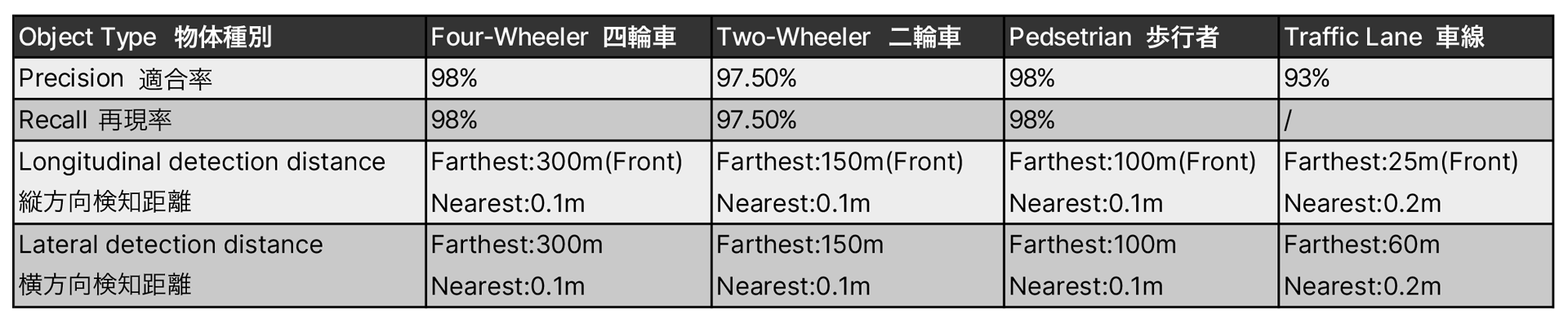 GTS は主要カテゴリ(車両・歩行者など)で Precision / Recall 98% を達成しており、高精度・高再現性を実現しています。さらに、前方最大 500m の広域観測に対応し、高速走行環境や予測系アルゴリズム向けにも有用なデータを提供します。これにより誤学習・過学習のリスクを抑え、学習・評価の両面で品質が向上します。