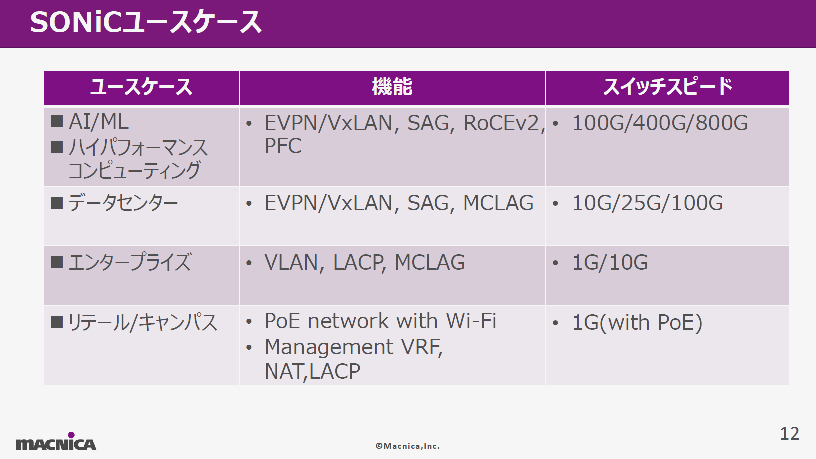次に、SONiCで具体的にどんな機能が活用できるのか、スイッチのポートスピードの例をまとめた表をご紹介します。