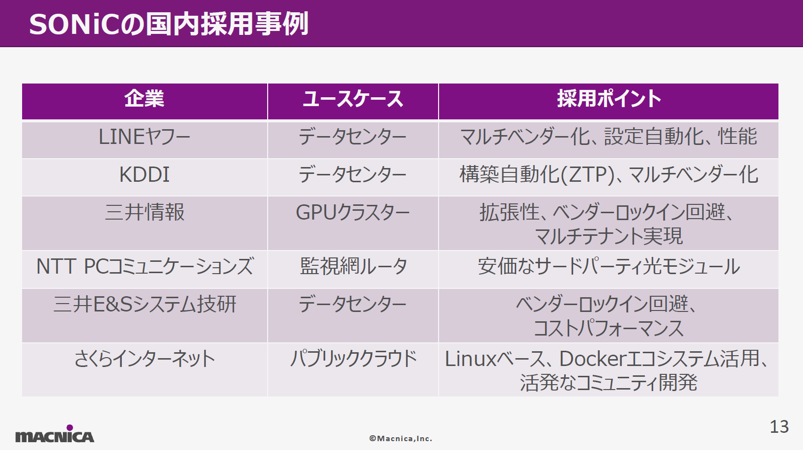 三井E&Sシステム技研:データセンターの大規模ネットワークにて、Edgecore SONiCとEdgecore製スイッチを約100台規模で導入。自動運転データの収集・転送用途に活用され、PoCフェーズから実際の商用フェーズでもSONiCが使用されるケースとなっている。