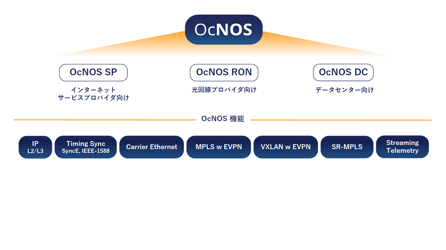 OcNOSは従来の「ZebOS」のL2/L3機能に加えて、VXLANやMPLS機能などの幅広いプロトコルをサポートしています。