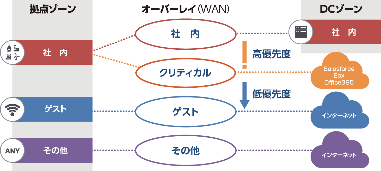 VLAN、物理I/F、サブネットI/Fといったゾーンごとにセグメンテーション・NW分離が可能 各ゾーンを仮想WAN(オーバーレイ)にマッピングすることもできます。