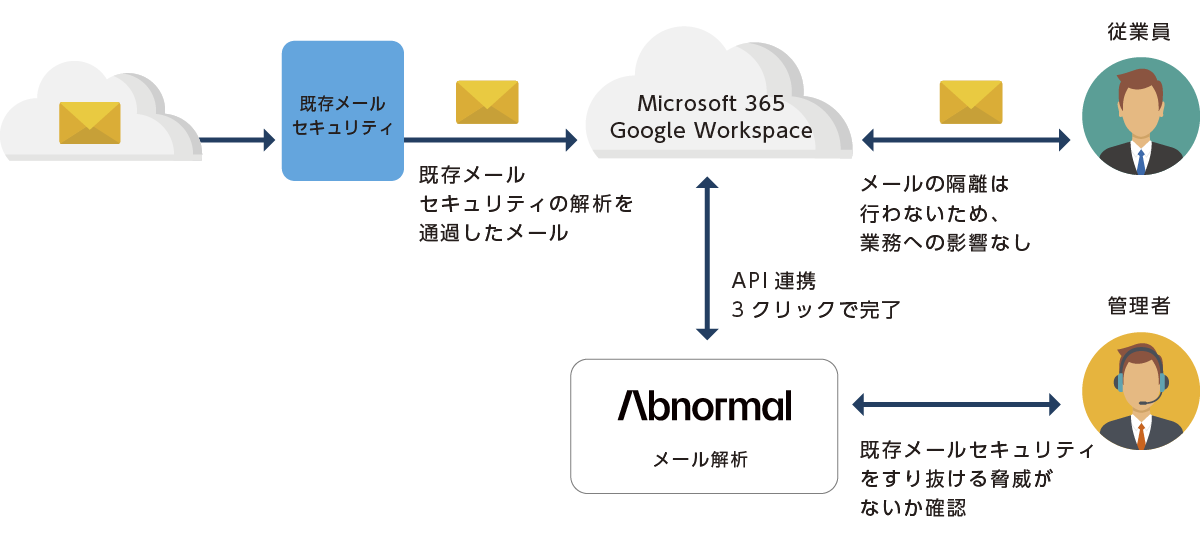 近年、BEC(ビジネスメール詐欺)や巧妙なフィッシングなど、従来のメールセキュリティをすり抜ける高度な攻撃が急増しています。Abnormal AI は、送受信者の関係性や振る舞いの異常を分析することで、従来型製品では見逃されがちな攻撃を高精度に検知します。アセスメント導入はわずか 3 クリックの API 連携だけ。既存メールフローの変更も、メール隔離や遅延も一切発生しません。