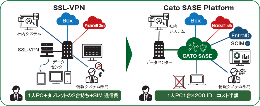 - 社外から社内業務システムへ安定してアクセス可能になり、接続切断や遅延が大幅に減少自宅や外出先からでも、Microsoft 365 や Box などのクラウドサービスを含めて快適に利用可能