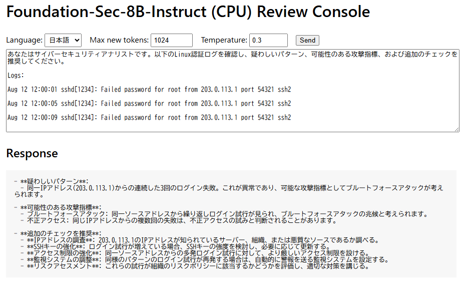 ローカルLLMであるため、機密データのプライバシーを確保しながらAIを活用できる点はSOC担当者にとって非常にありがたい存在になるのではないかと個人的には感じております。