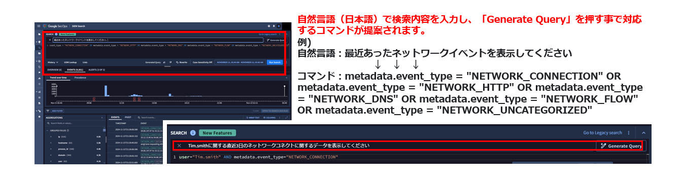 Google SecOpsのSIEM検索はまるで同僚に話しかけるかのように、普段使いの言葉で検索したい内容を入力するだけでAIがその意図を理解し、適切な検索クエリを提案します。
