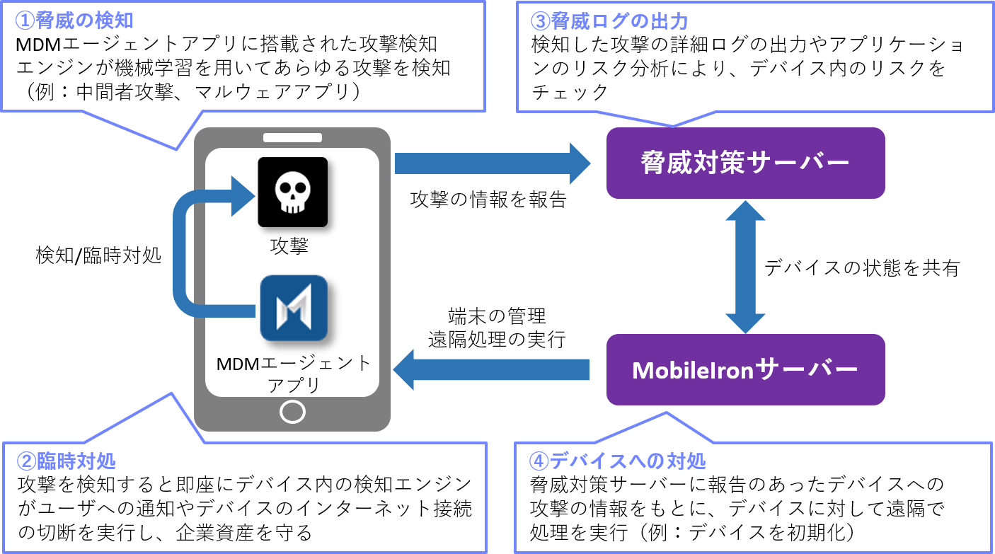 - MobileIron MDMサーバーに脅威を報告し、デバイス内の企業データを遠隔削除