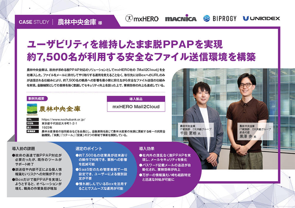 農林中央金庫は、政府が求める脱PPAP対応のソリューションとしてmxHERO社の「Mail2Cloud」を全社導入した。ファイルをメールに添付してやり取りする運用を変えることなく、取引先にはBoxへのURLのみが送信される仕組みにより、約7,500名の職員への影響を最小限に抑えながら安全なファイル送信の仕組みを実現。金融機関としての責務を強く意識してセキュリティ向上を図った上で、業務効率の向上も達成している。