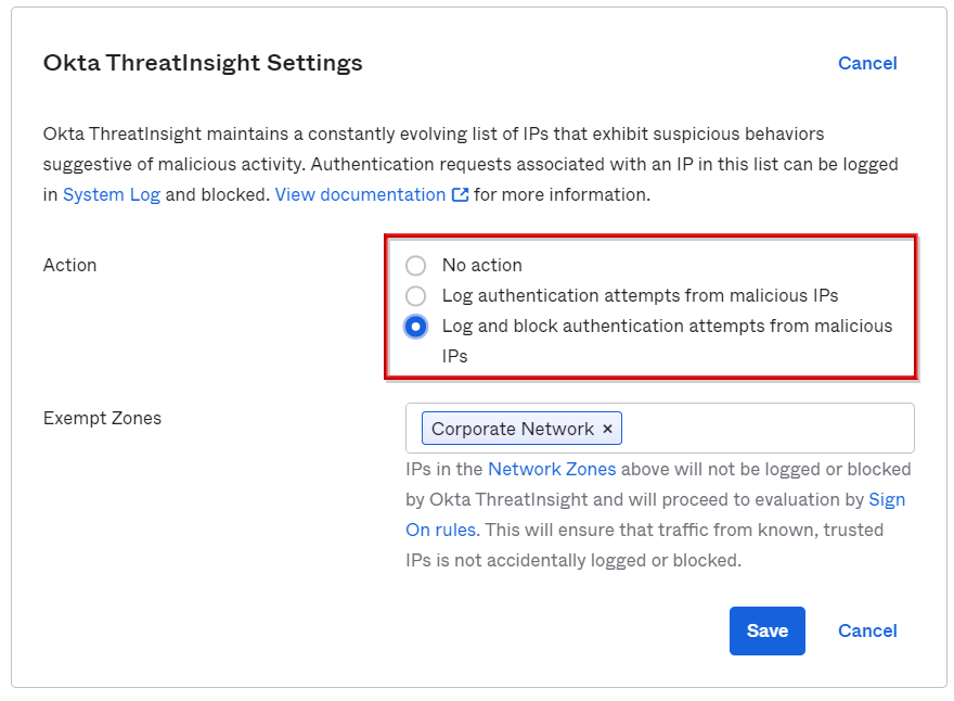 ThreatInsight機能は、不審なIPからログインの試みがあった際に、それを検出し、検出ログを出力したり、ログインをブロックするアクションを実行するものです。この機能を利用することで、不審なIPから繰り返し実行されるログインの試みによるロックアウトを防ぐことが可能となります。このログ出力とブロック機能の有効化はOkta社により推奨されています。