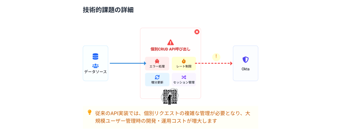 - レート制限の問題:大量ユーザー(数万~数十万)の同期時のAPI制限