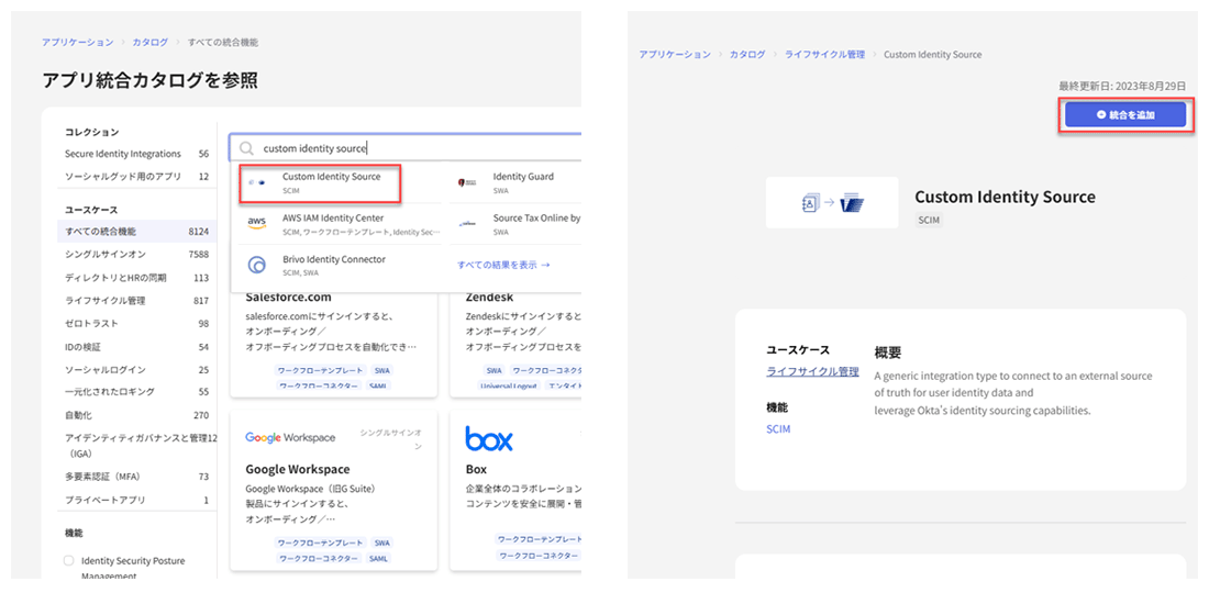 - アプリ統合カタログから「Custom Identity Source」で検索