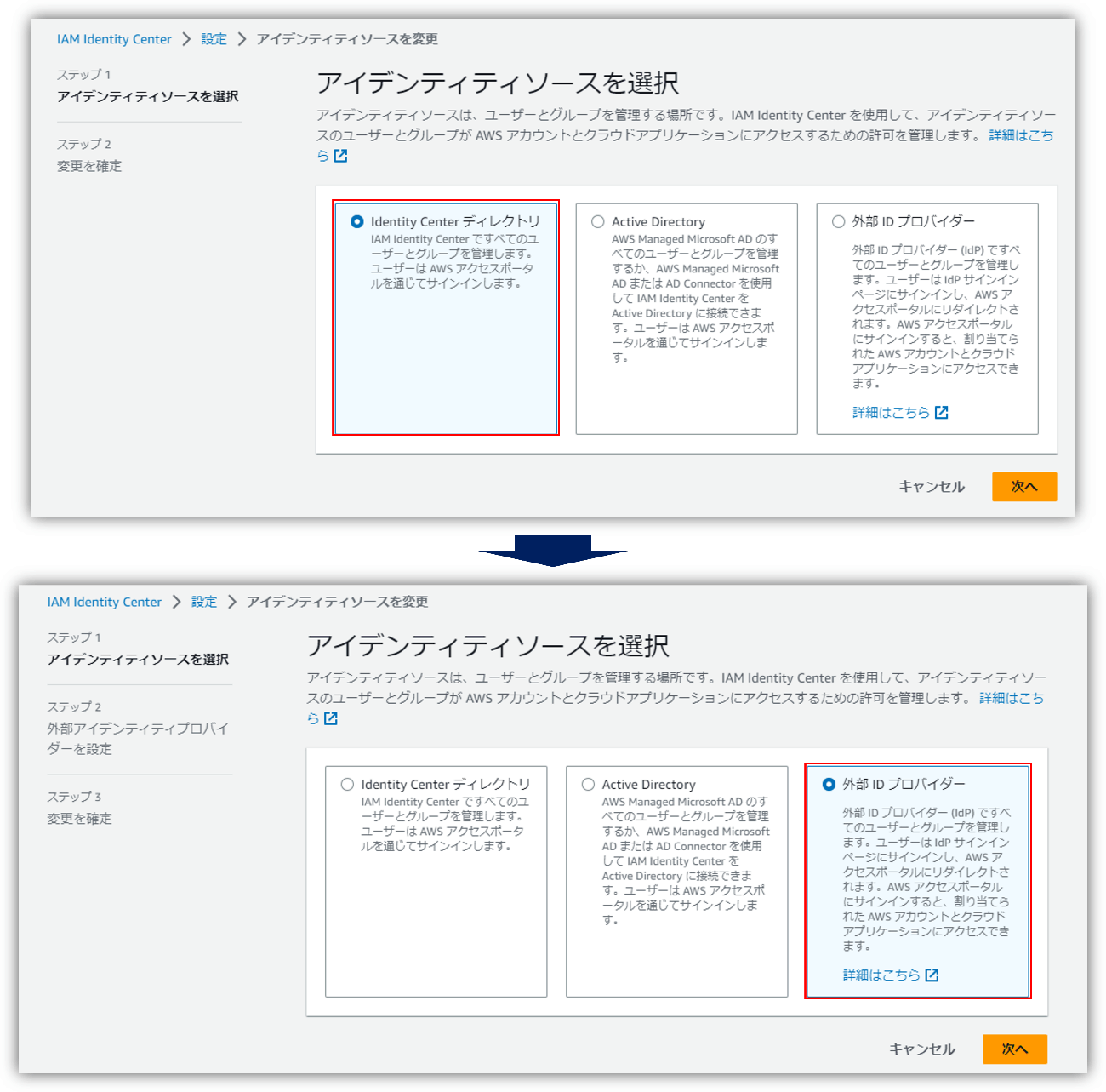 - アイデンティティソースとして、「Identity Center ディレクトリ」>「外部のIDプロバイダ―」を選択