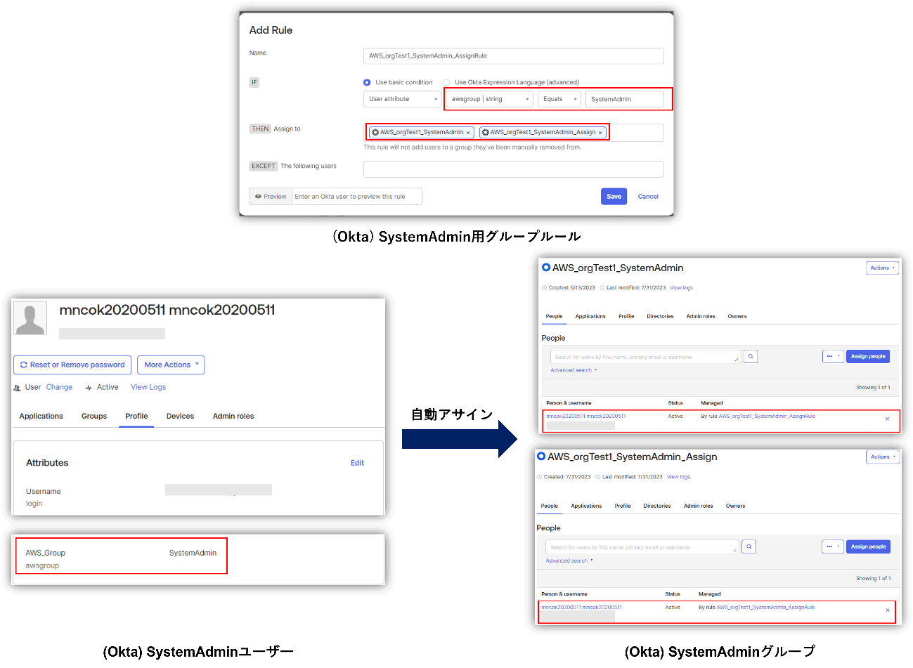 まず、ユーザーのカスタム属性として「AWS_Group」を作成し、AWS IAM Identity Centerでアサインしたい許可セット(例:SystemAdministrator)をその属性値として指定しておきます。その後、「AWS_Group属性値が"SystemAdministrator"であるユーザーをAWS_SystemAdminグループへ所属させる」といったグループルールを作成します。