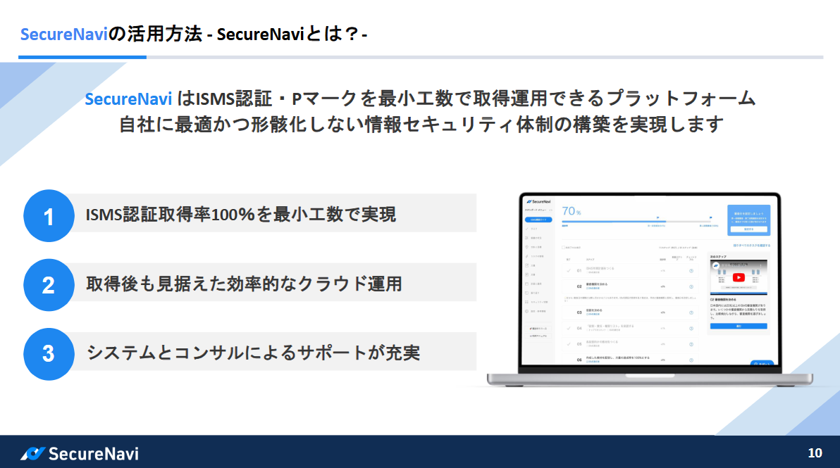 機密性、完全性、可用性の3つの要素について詳しく解説し、各要素がISMSの基本となることを示す。 - SecureNaviの利用による課題解決方法を具体的に紹介
