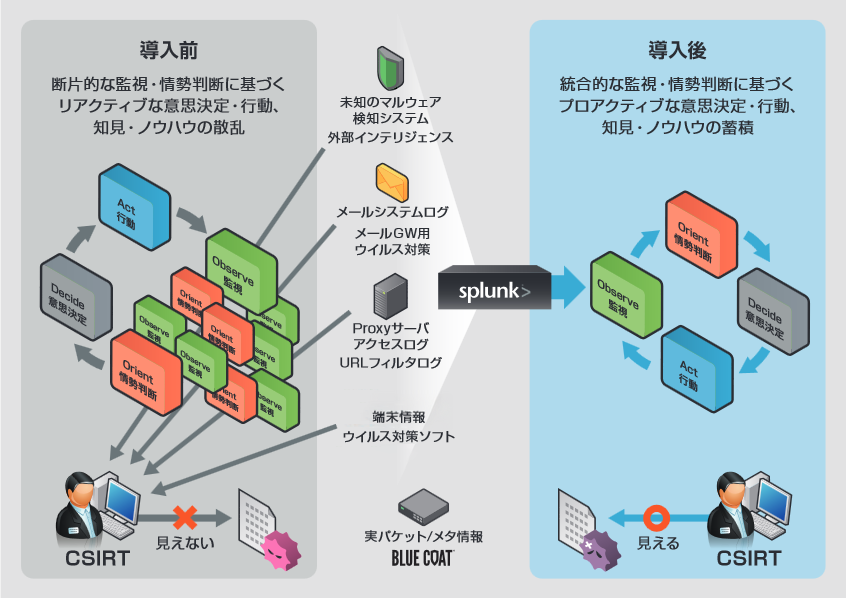 Splunkの導入後、インシデント調査のプロセスを実際に運用していくと大きな変化があった。導入前は、プロキシやサンドボックスなどの各ログだけを断片的に監視(Observe)し情勢判断(Orient)するだけで、リアクティブな意思決定(Decide)や行動(Act)につながり、対策が後手に回るとともに知見やノウハウがCSIRT内で散逸している状況だった。