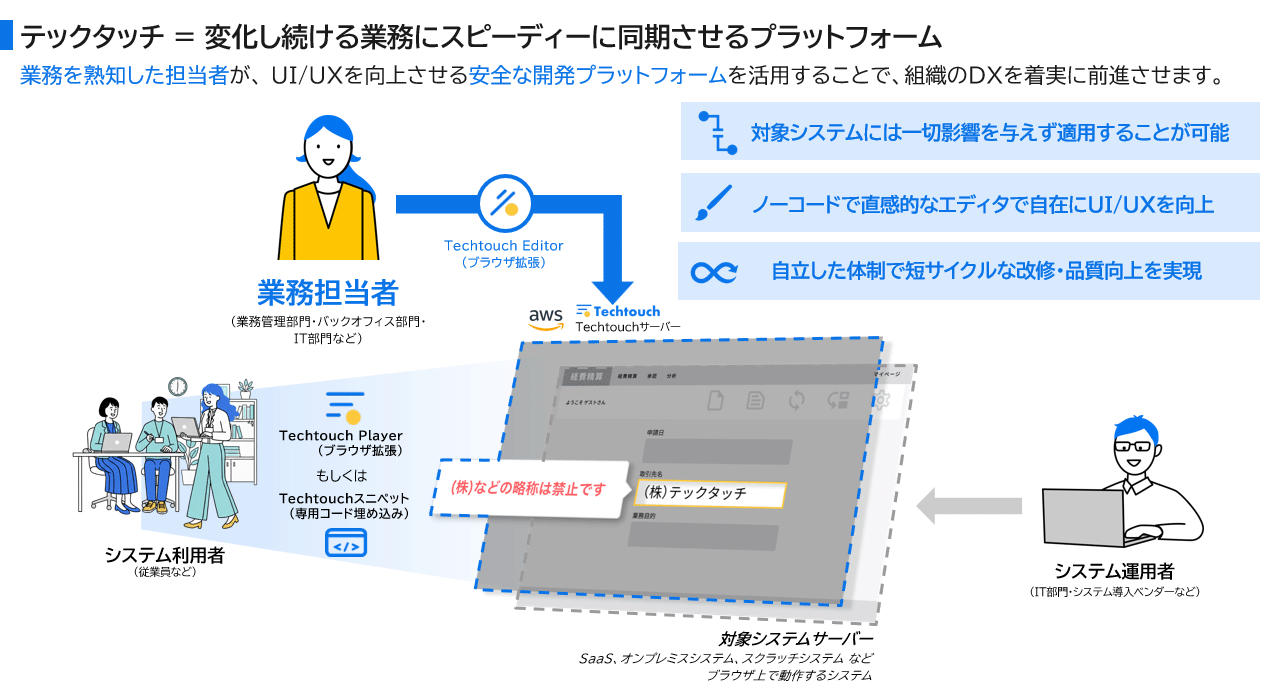 テックタッチは、Web画面に操作ガイドや注意喚起を重ねて表示できるデジタルアダプションプラットフォーム(DAP)です。