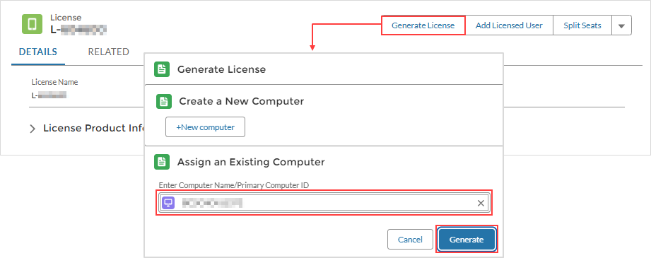 3. ページ右上にある [Generate License] ボタンをクリックします。