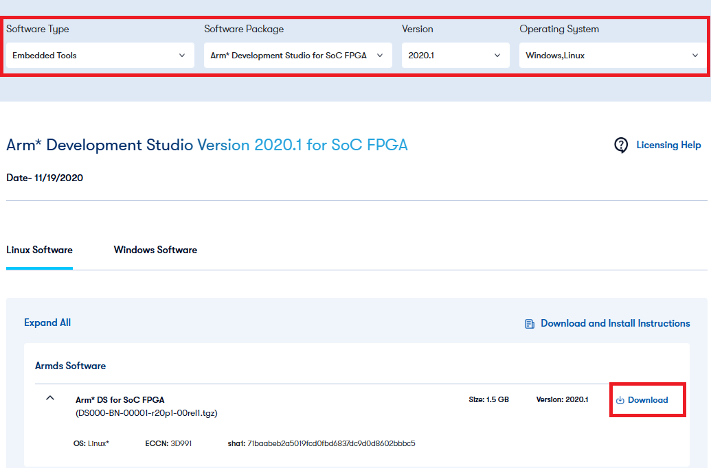 ● Altera® のダウンロード・センターへアクセスして Arm* Development Studio をダウンロードします。