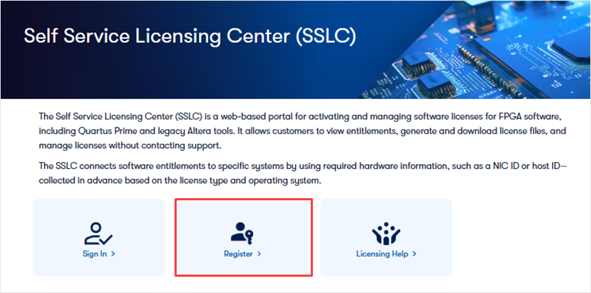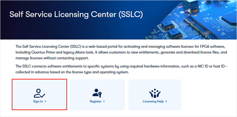 Altera® FPGA の開発において、有償の Quartus® Prime 開発ソフトウェアや有償 IP (Intellectual Property)、Questa* - Altera® FPGA Edition などをご利用になる場合、その製品のライセンスファイルが必要です。ライセンスファイルは、購入後にメーカーの専用サイト “Self Service Licensing Center (SSLC)” でお客様自身 (ライセンス管理者) が取得します。はじめて Self Service Licensing Center にサインインする場合は、事前に利用登録をおこなってください。