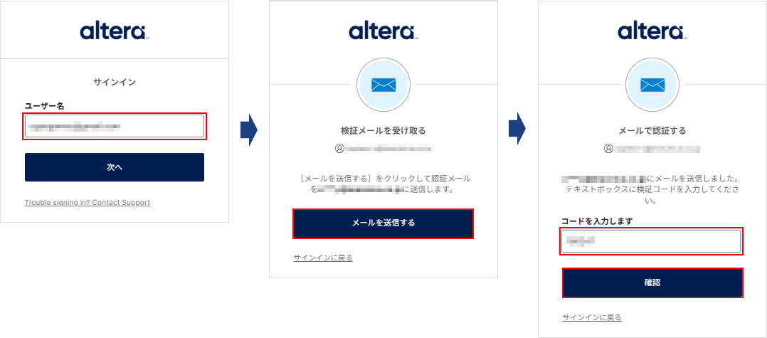 3. Altera アカウントのユーザー名を入力すると、登録済みのメールアドレス宛に認証コードが送信されます。